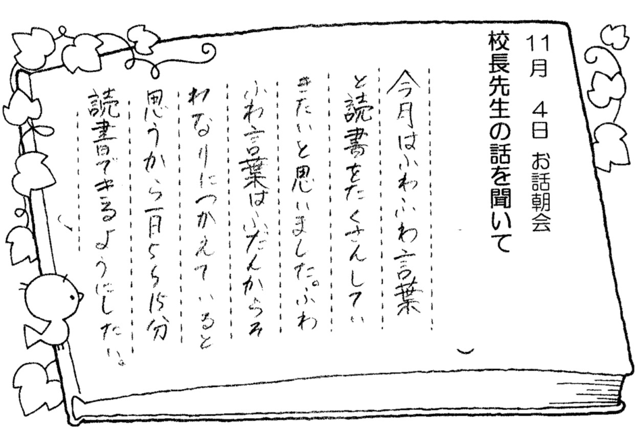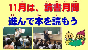 11月は読書月間です。本を読むと、漢字や言葉を覚え、想像力や集中力が高まります。読書は考える力を育てる大切な習慣です。生活目標も「進んで読書をしよう」です。みんなで読書を楽しめるように応援していきます。
