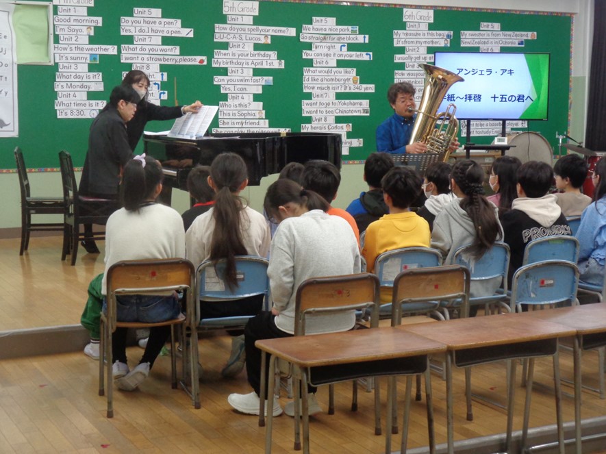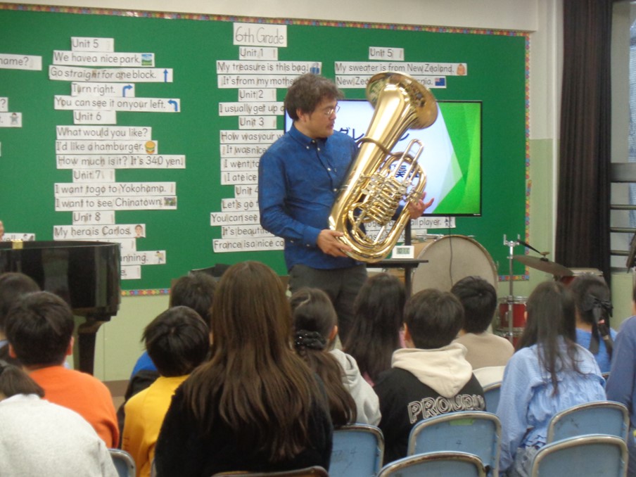 重厚であたたかなチューバの音色と、ピアノの美しい響きが重なり合うハーモニーに、子どもたちは静かに耳を傾け、会場は感動に包まれました。演奏後には子どもたちからの質問にも丁寧に答えてくださり、楽器の魅力や演奏家としての思いを直接聞く貴重な機会となりました。子どもたちにとって、音楽の力と表現のすばらしさを実感する特別なひとときとなりました。
