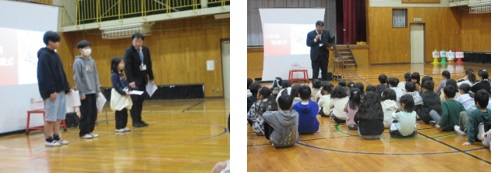 1学期は、書写の時間に練習を重ねてきた硬筆と、全校で取り組んだ上富小タイピング大会の表彰です。入賞した児童の名前が呼ばれるたびに、体育館に歓声と拍手が響き、お互いの頑張りを認め合える素敵な表彰朝会となりました。