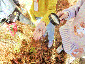 最後に、足立さんからの「この落ち葉にカブトムシのお母さんが卵を産みにきて、やがてカブトムシが生まれるのです。落ち葉も大切な資源なんですよ。」と説明を耳にすると、子供たちからは「カブトムシがいっぱいになるといいな。」、「落ち葉も大切にします。」などのつぶやきが聞こえてきました。環境を大切にしていこうする思いが一層強くなったようです。