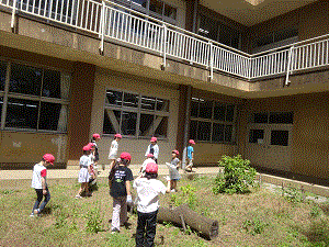 校舎裏の木の剪定も行いました。集められた枝は、「木の虫元気」に集められました。上から踏みつけ、盛り上がった枝の山を小さくまとめていきました。ここにも様々な虫が集まります。