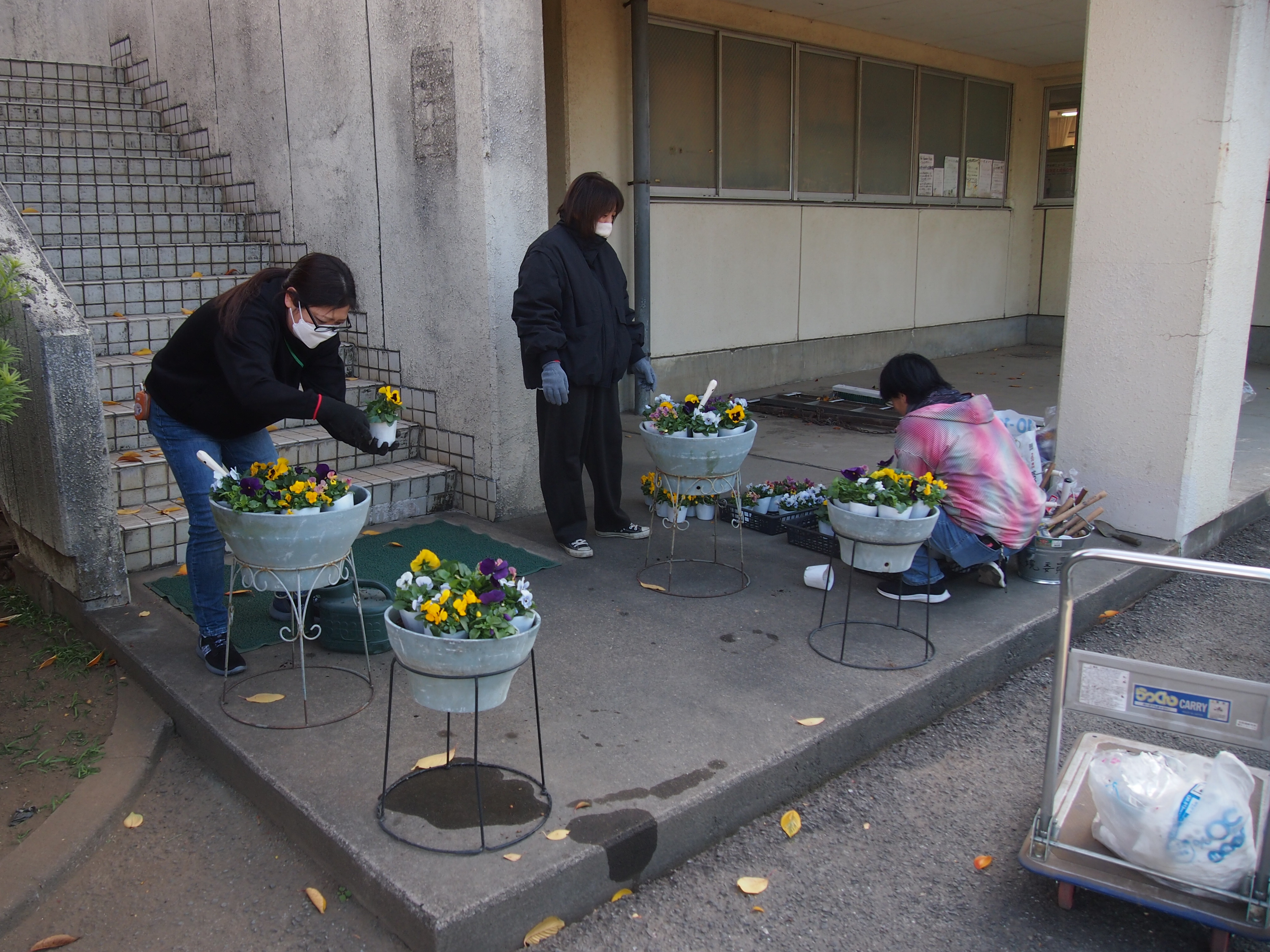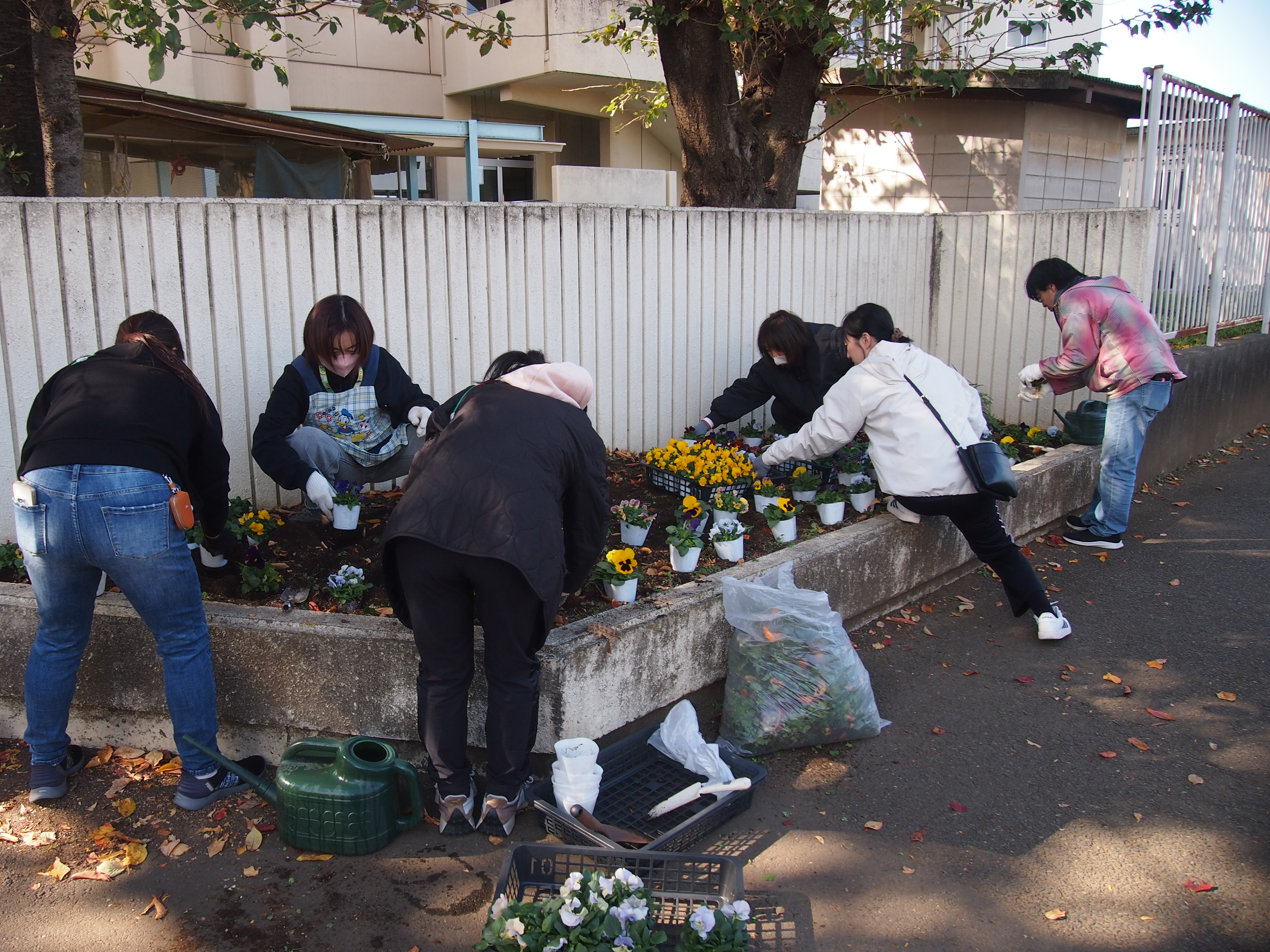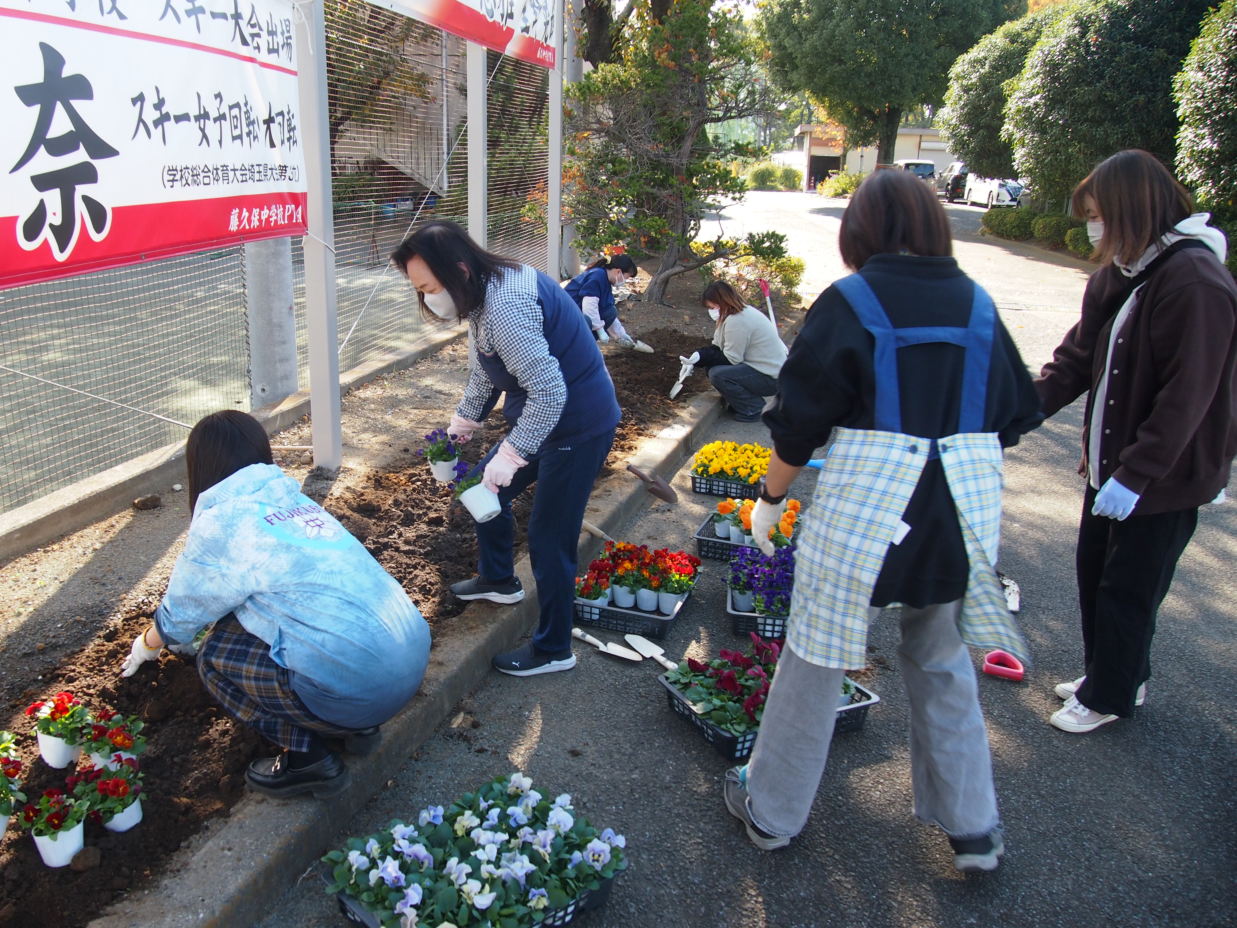 PTA パンジー植え替え(R7.11.20) 保護者の方と学校運営協議会の皆様のご協力をいただき、パンジーの植え替えを行いました。正門からの通路、校庭の校舎側、裏門、職員玄関の入口に植えてありますので来校された際にご覧ください。学校が花でいっぱいになり、気分も高まります。